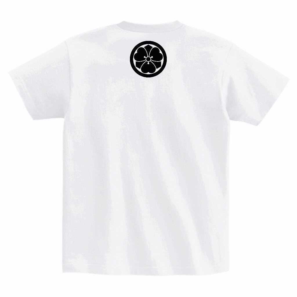 このTシャツでは、直家の花押を左胸に、家紋を背面にあしらい、歴史を“着る”仕様にしました。