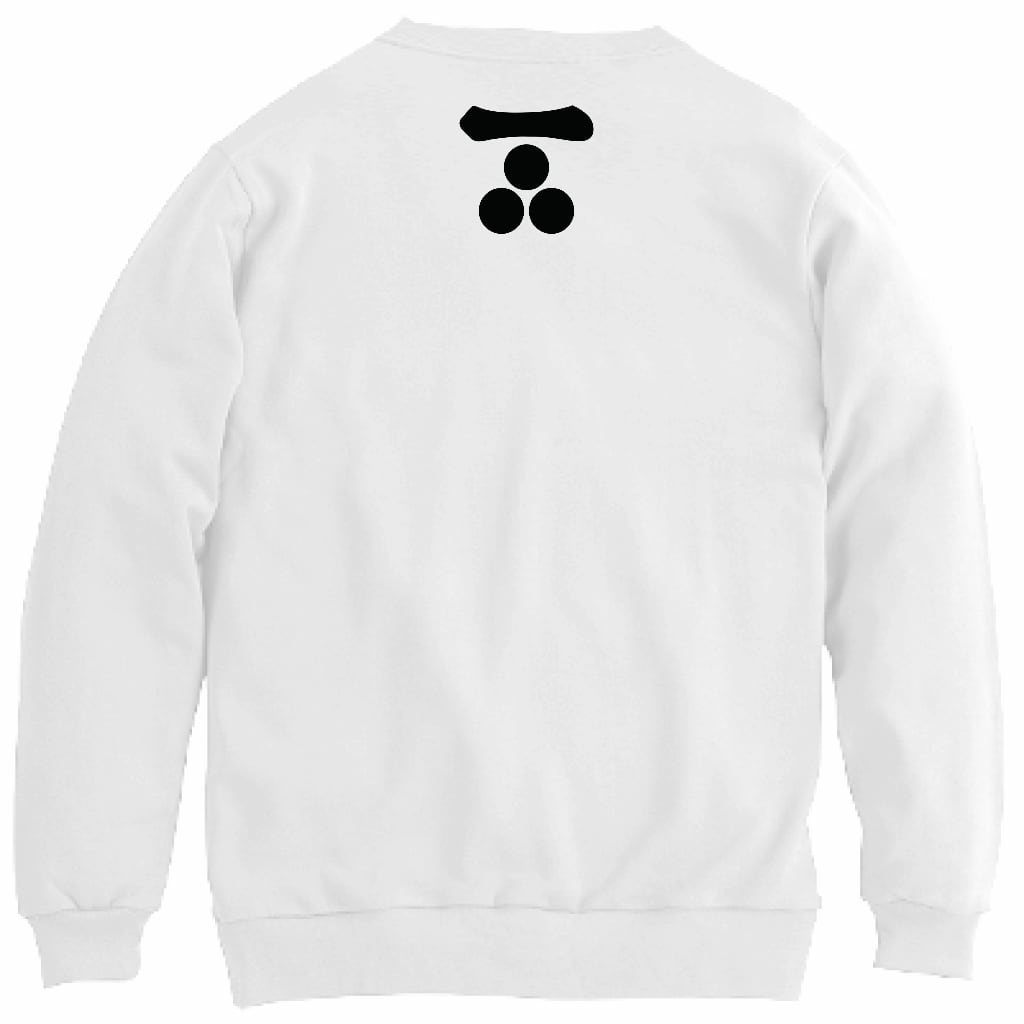 このトレーナーでは、元就の花押を左胸に、家紋を背面にあしらい、歴史を“着る”仕様にしました。