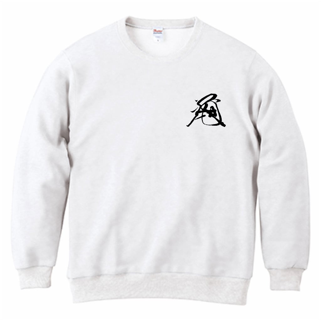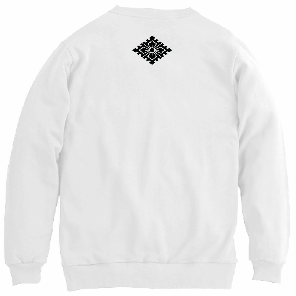 このトレーナーでは、晴賢の花押を左胸に、家紋を背面にあしらい、歴史を“着る”仕様にしました。