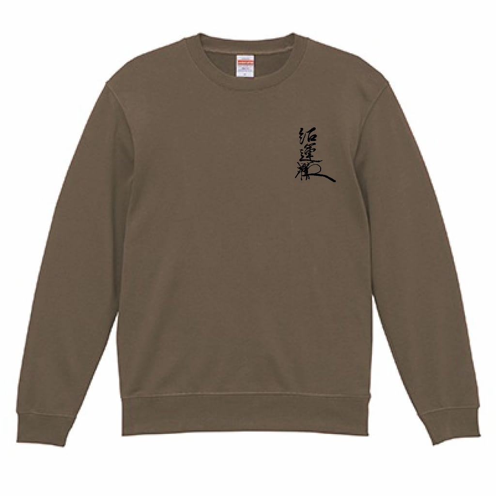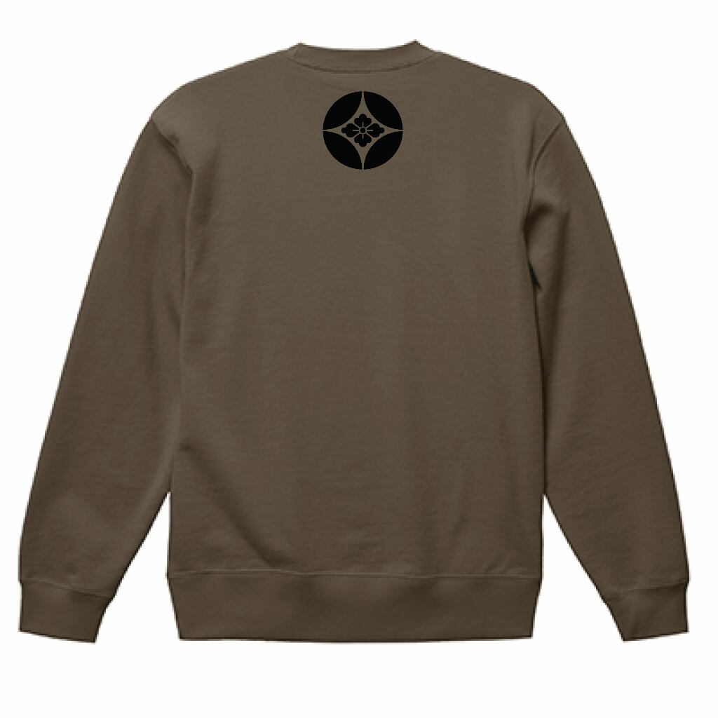 このトレーナーでは、紹運の花押・自署を左胸に、家紋を背面にあしらい、歴史を“着る”仕様にしました。